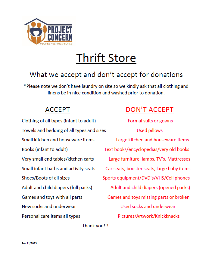 **Please see below to see a list of items we are currently accepting and cannot accept for our thrift store.